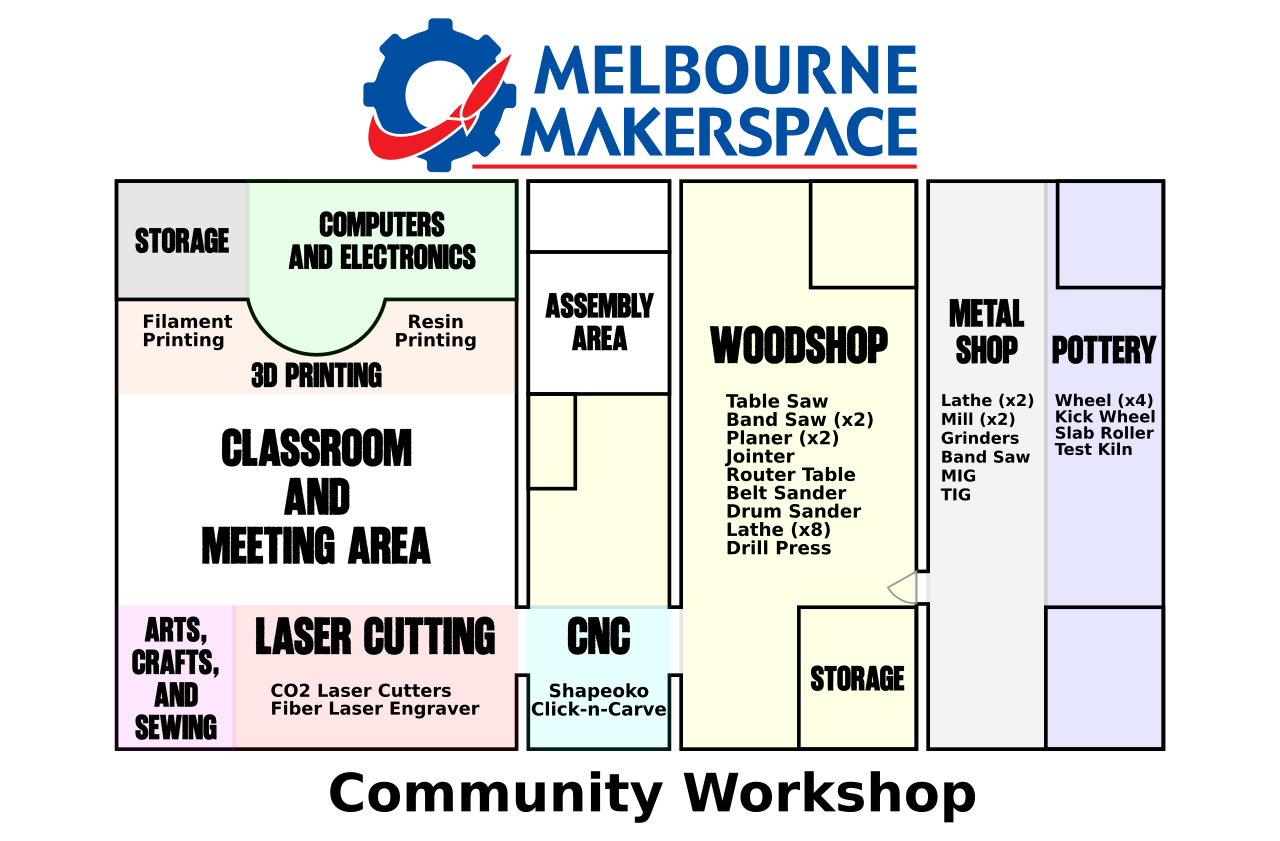 Melbourne Makerspace occupies several suites (125-128) in the Palm Tree Plaza. The Wood Shop, housed in Suite 127, is the most utilized part of the Melbourne Makerspace. The entry room of Suite 126 enters into has an open space with tables and a refrigerator. This room houses Arts & Crafts, Laser Cutters, 3D Printing, Resin Printers, Electronics & Programming. The rest of Suite 126 primarily comprises of storage space and bathrooms. Of note, there is a private CNC machine that can be used with permission from the owner, and an Assembly room. Suite 128 is shared between the Metal Shop and Pottery Shop. The Board is not actively working on growth as they are focused on securing longevity through more solid organizational structure. This includes applying for 501(c)(3) status as well as improving tool documentation, formalizing onboarding and training procedures to ensure safety, and physical tidying to optimize flow for members. https://wiki.melbournemakerspace.org/maps/floorplan%202026.png